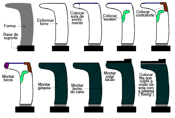 Fig. 24 – Sequência das operações de montagem dos componentesConcluída a fase de confecção, os moldes de sapatos ou botas são colocados nos suportes da autoclave, seguindo-se a operação de vulcanização (Figura 25).