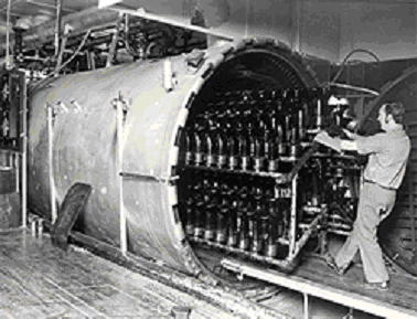 Fig. 25 – Autoclave de vulcanizaçãoA vulcanização tem a duração de 30 minutos, à temperatura de 130ºC e com uma pressão de ar de 1,4 kg/cm2. A autoclave pode também ser pressurizada com azoto, o que é melhor para evitar a reversão dos compostos de borracha. Os componentes de borracha a vulcanizar devem possuir curvas de vulcanização do tipo “patamar” longo, para permitir obter um bom grau de vulcanização, sem que ocorram fenómenos de reversão, especialmente se for utilizada uma atmosfera de ar.
