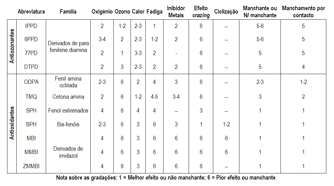Apresenta-se no Quadro 3 uma comparação do desempenho, nas composições de borracha, dos principais agentes antioxidantes e antiozonantes.