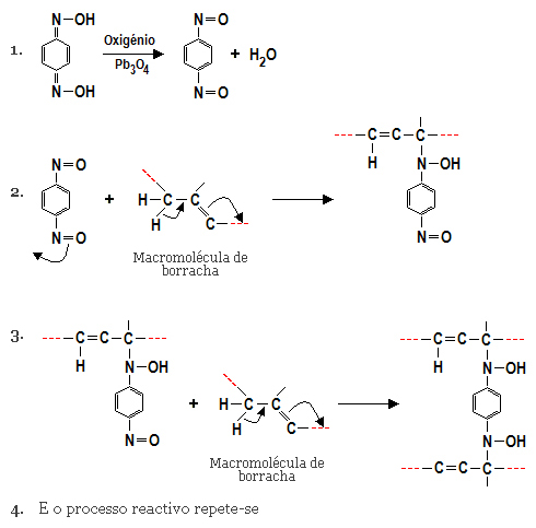 Na Figura 15 apresenta-se o mecanismo do processo de vulcanização com uma quinona dioxima, na circunstância a já referida p-benzoquinona dioxima.