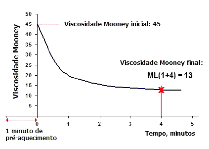 Na Figura 5 mostra-se o aspecto de uma curva de viscosidade Mooney. Após 1 minuto de pré-aquecimento à temperatura de ensaio seleccionada, o rotor é posto em movimento e obtém-se um valor máximo de viscosidade. A partir deste ponto a viscosidade decresce de uma forma mais ou menos rápida, tudo dependendo da constituição da borracha e por efeito da homogeneização da sua temperatura. Ao fim de 4 minutos o ensaio é suspenso e regista-se o valor de viscosidade, que é viscosidade Mooney ML (ou MS) (1+4 minutos), a x ºC de temperatura, ou outra diferente das condições acima referidas.
