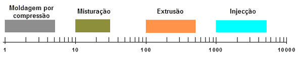 Em todos os processos de transformação é gerado calor por atrito interno. E este atrito interno é tanto mais elevado quanto mais elevada é a velocidade de corte característica do processo. Ora o processo de injecção é aquele que maior velocidade de corte provoca na borracha. A Figura 8 mostra as faixas de velocidade de corte para os principais processos de transformação. A escala usada é logarítmica, uma vez que existe uma relação de 5000 entre a velocidade de corte mínima e a máxima.