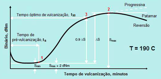 No tema “Vulcanização” já abordamos os métodos e instrumentos para controlar o grau de vulcanização. Vimos então uma curva típica obtida num reómetro e alguns dos parâmetros que essa mesma curva permite determinar, informações que também podem ser fornecidas automaticamente em relatório de ensaios, sem ser necessário registar a curva, se o software do equipamento o possibilitar. Esses parâmetros são: o binário mínimo Smín, o tempo de pré-vulcanização ts, o binário máximo Smáx, o valor de t90, (eventualmente t80, t85, e t95) e o IVV (ou CRI). Recordemos a curva então apresentada e que aqui repetimos como Figura 6: